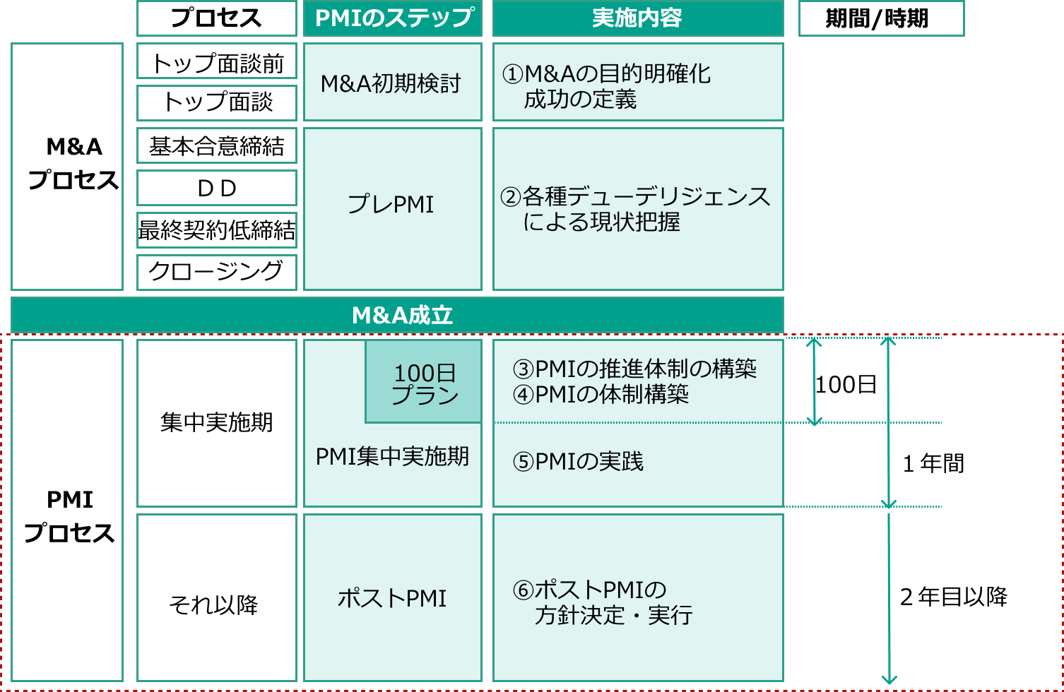 財務的な成果を早期に実現することよりも、統合によって事業の継続や、中長期にわたる持続的な成長を目的として数年単位で継続的に取り組むべき活動とも言えます(下記「ポストPMI」)。