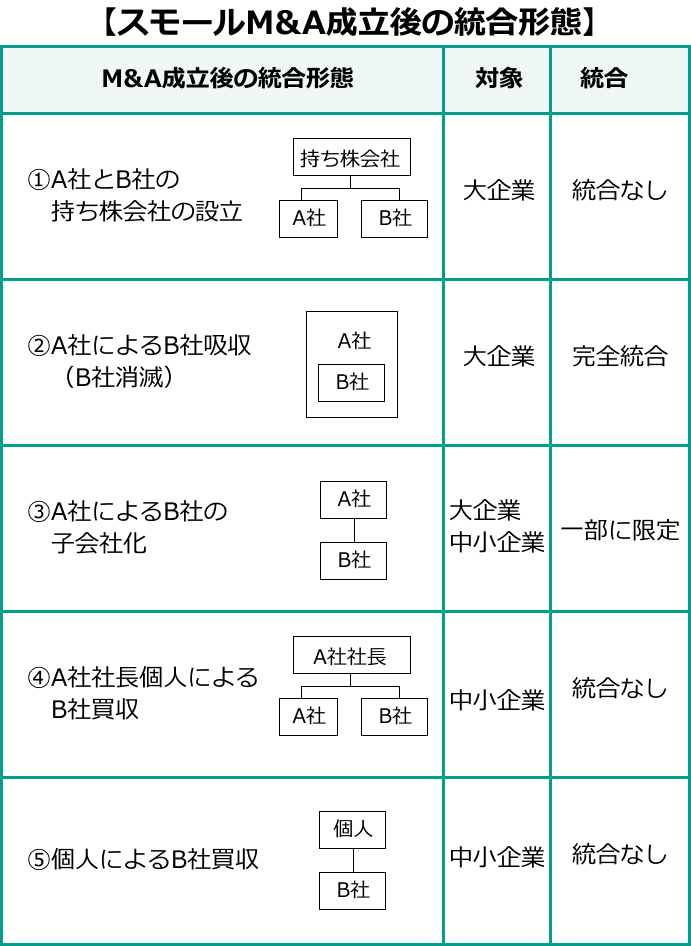 まず、M&A後の統合形態から、大企業とは目指す方向が違います。 左図が示すように、中小企業や個人が行うスモールM&Aでは、譲渡企業を完全に吸収するのではなく、独立性を維持するケースが主流です。 図の③~⑤のように、スモールM&Aでは譲渡企業(B社)を買い手(A社)から独立した法人として維持し、新社長(個人を含む)が経営を引き継ぎます。 これは、大企業のように完全な経営・業務統合を目指すのではなく、統合は管理業務のみなど一部に限定するケースが多く見られます。 これは、まず最優先されるのが、譲渡企業の独立性を保ち、経営を安定させることとなるためです。 社風や従業員の雇用を守り、譲渡企業の価値を損なわないことが重要視されます。 そのため統合も、会計基準の統一や共同仕入れといった効果の出やすい部分に限定した、緩やかな連携から始めることが多くなるのです。