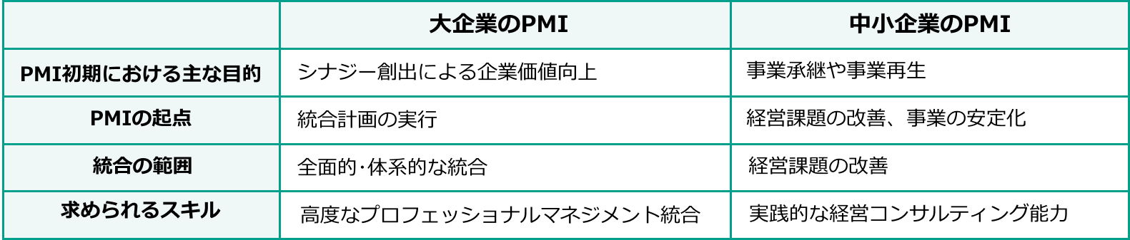 一方で、中小企業のPMIは、事業の立て直しから始まることが多く、その性質は大きく異なります。