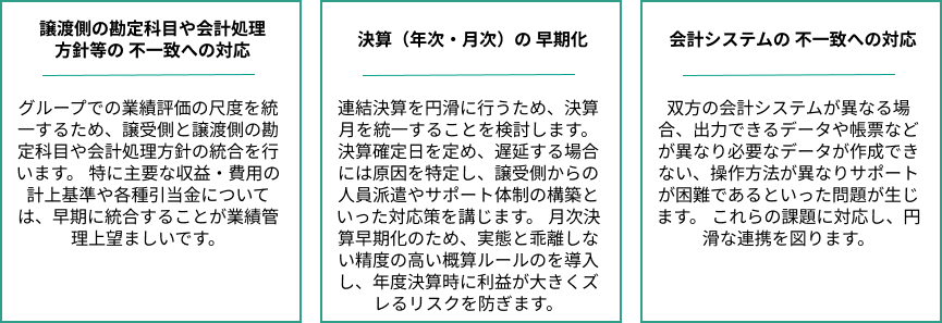 中小企業とのM&Aでは、経理担当者の不足、不適切な会計処理、月次決算の遅延、データ分析の未習慣化といった課題を抱えていることが少なくありません。 そのため、M&Aの形態を問わず、会計・財務プロセスの適正化や業績管理体制の構築は、PMIにおける極めて重要なテーマとして取り組む必要があります。 その上で、M&Aの実施形態によって留意すべき点が異なります。
