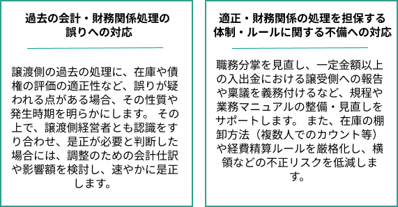 譲渡側の過去の会計処理に誤りがあれば是正し、今後の適正な処理を担保する体制とルールを構築します。