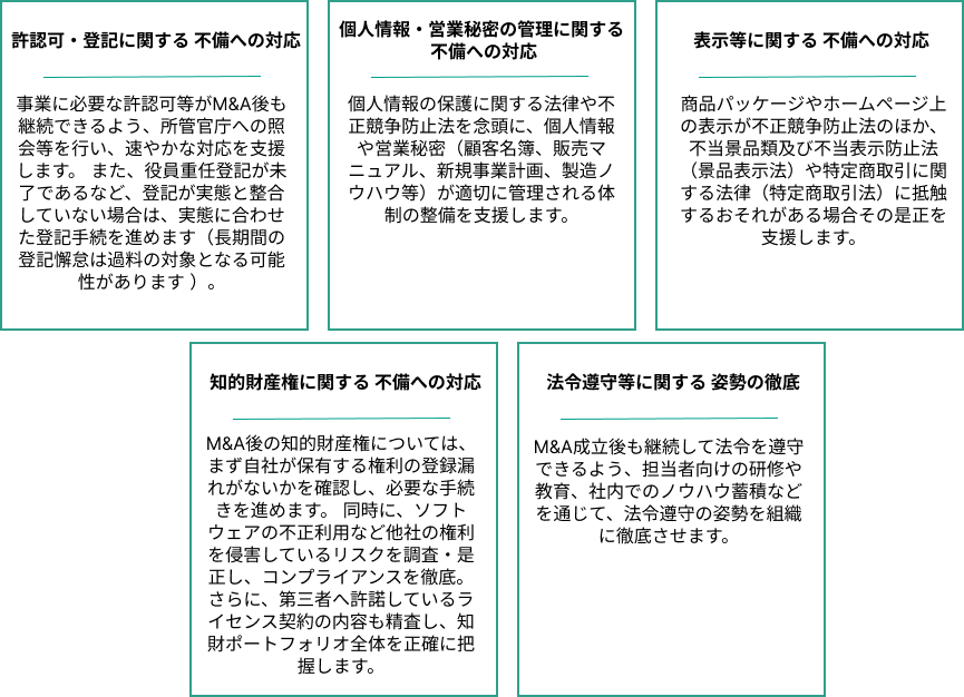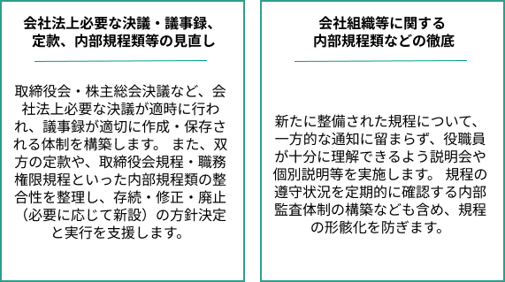M&Aに伴う法的な課題やリスクに適切に対応し、法令遵守を前提とした健全な会社組織の構築を支援します。