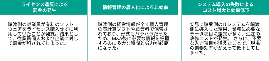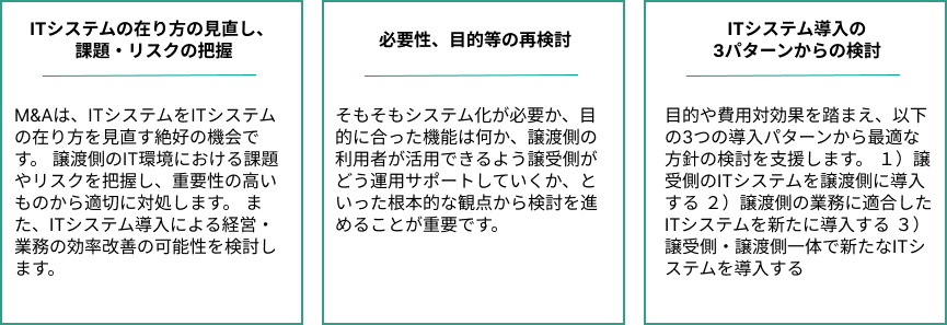適切な経営管理や業務効率化に不可欠なITシステムについて、M&Aを契機に全体像を見直し、コストと効果のバランスを鑑みながら最適な形を追求します。