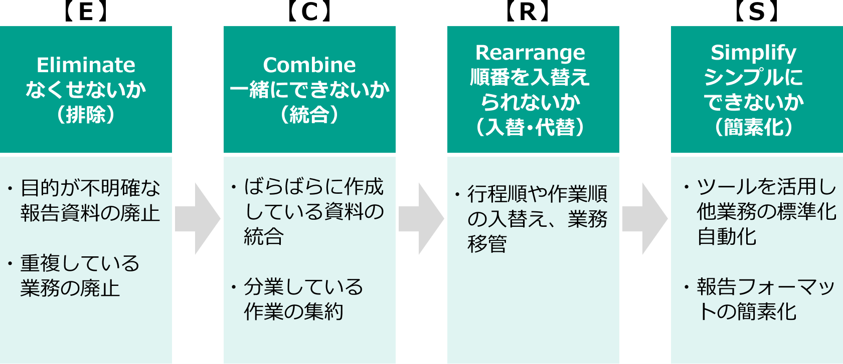 業務を可視化する中で、特に無駄や非効率が発生している業務を特定します 。 その上で、ECRS(下図)と呼ばれる「排除」「統合」「入替・代替」「簡素化」の4つの観点から改善の方向性を検討し、業務の効率化を図ります 。