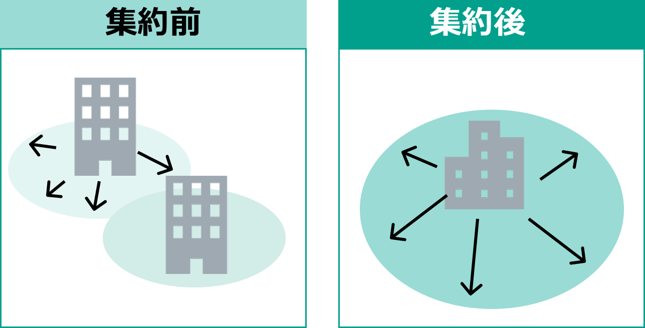 同一エリア内における営業体制の重複といった非効率を解消し、営業活動の効率化と、家賃などの拠点関連費用の削減を実現する活動です。